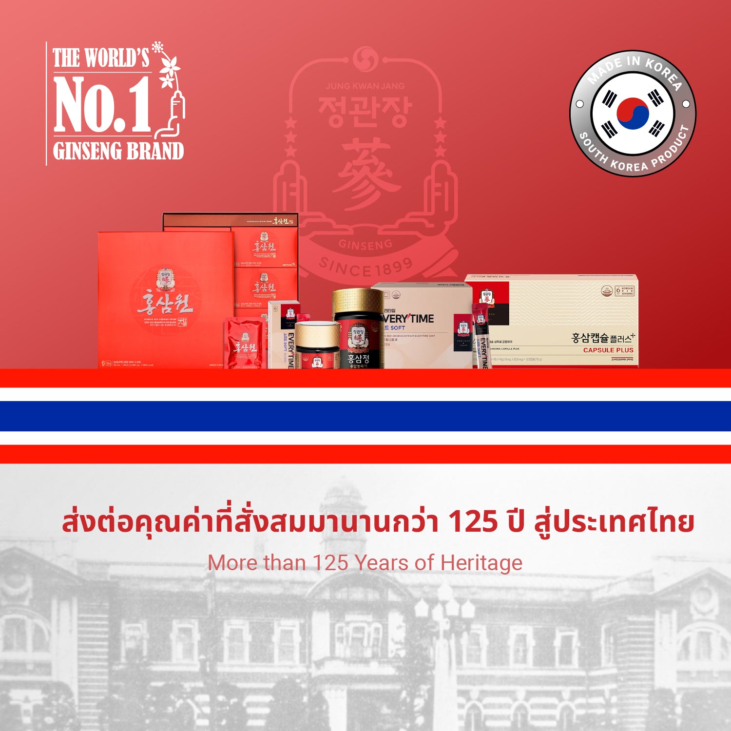 วันนี้ เราพร้อมแล้วที่จะส่งต่อเกียรติยศของโสมแดงเกาหลีและปรัชญาเพื่อการมีสุขภาพที่ดี ซึ่งเราบ่มเพาะด้วยความตั้งใจมานานกว่าศตวรรษสู่ชาวไทย ขอเชิญทุกท่านร่วมสัมผัสความจริงใจของ JungKwanJang ที่ซึ่งพลังแห่งธรรมชาติอันเก่าแก่หลายพันปีมาบรรจบกับเทคโนโลยีอันทันสมัยได้แล้ววันนี้ในประเทศไทย